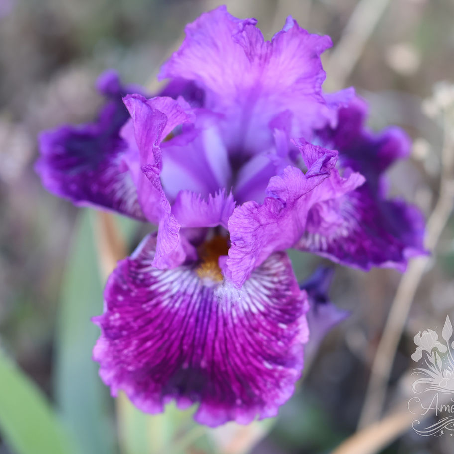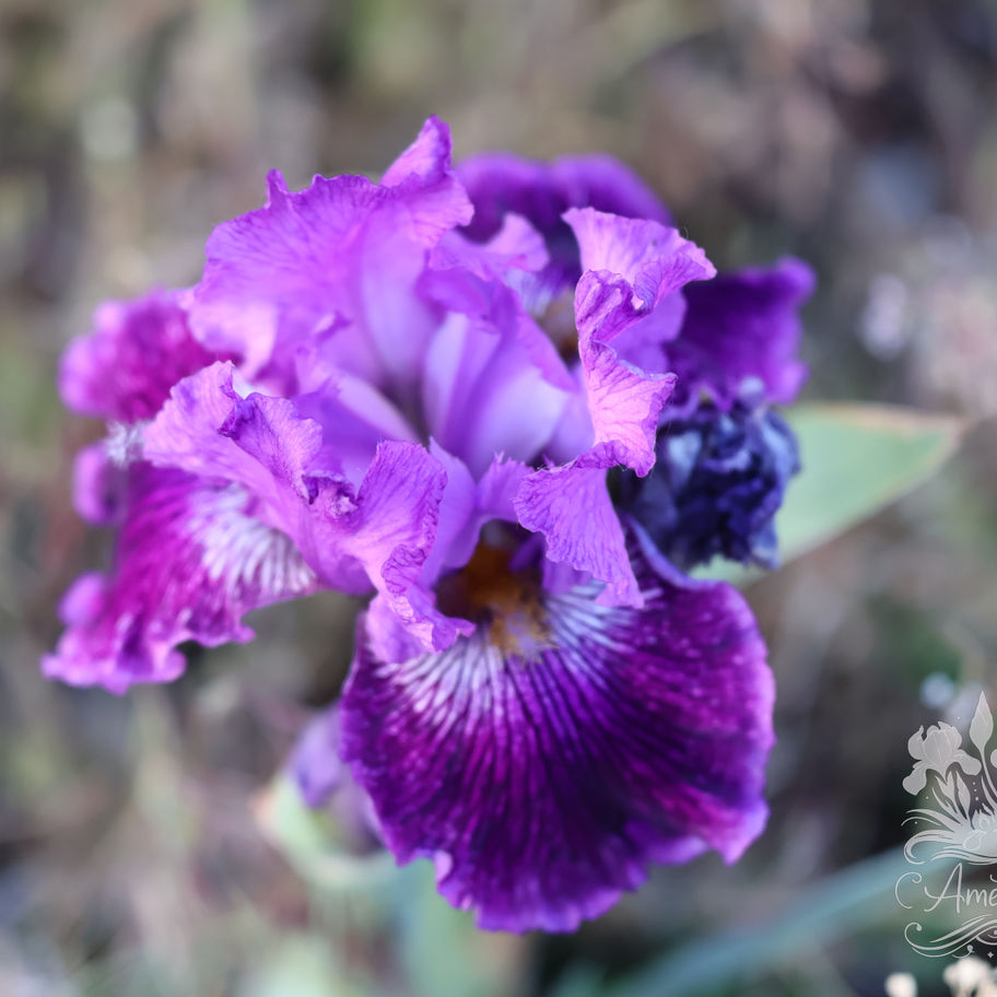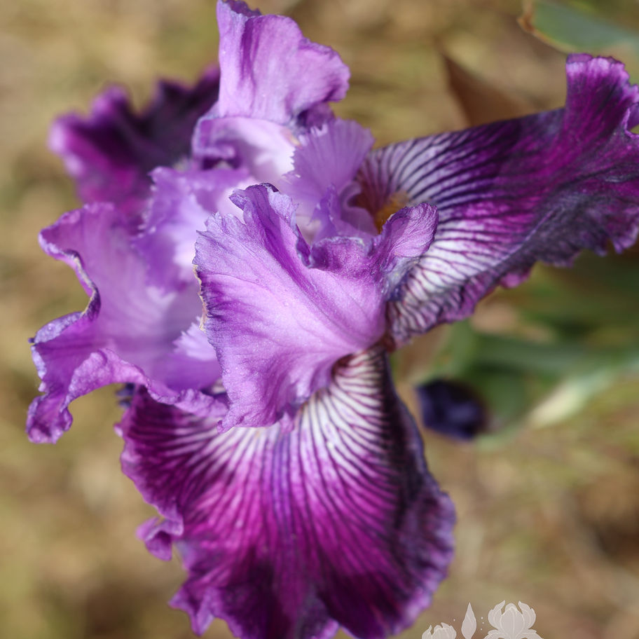 Above The Fray (Hugh Stout, 2020) is a tall bearded iris reaching 36" (91 cm) and blooming in the early midseason. This variety features standards in veronica violet, deepening toward the edges, with lavender style arms. The falls are a rich, deep dark purple, lightening near the beard and showcasing prominent dark purple and white veining radiating from the hafts—veining may extend around the beard or through the heart of the petal. A distinct ¼" violet edge frames the falls. The beards are based in lavender with bronze-tipped ends. Above The Fray is notable for its heavy ruffling and pronounced sweet fragrance. Bred from Mulberry Magic and a complex seedling lineage, it was introduced by Stout Gardens in 2020 and received an Honorable Mention in 2023. Available at Amethyst Creek Farm. Attributes: Edge Trim, Fragrant Awards: Honorable Mention