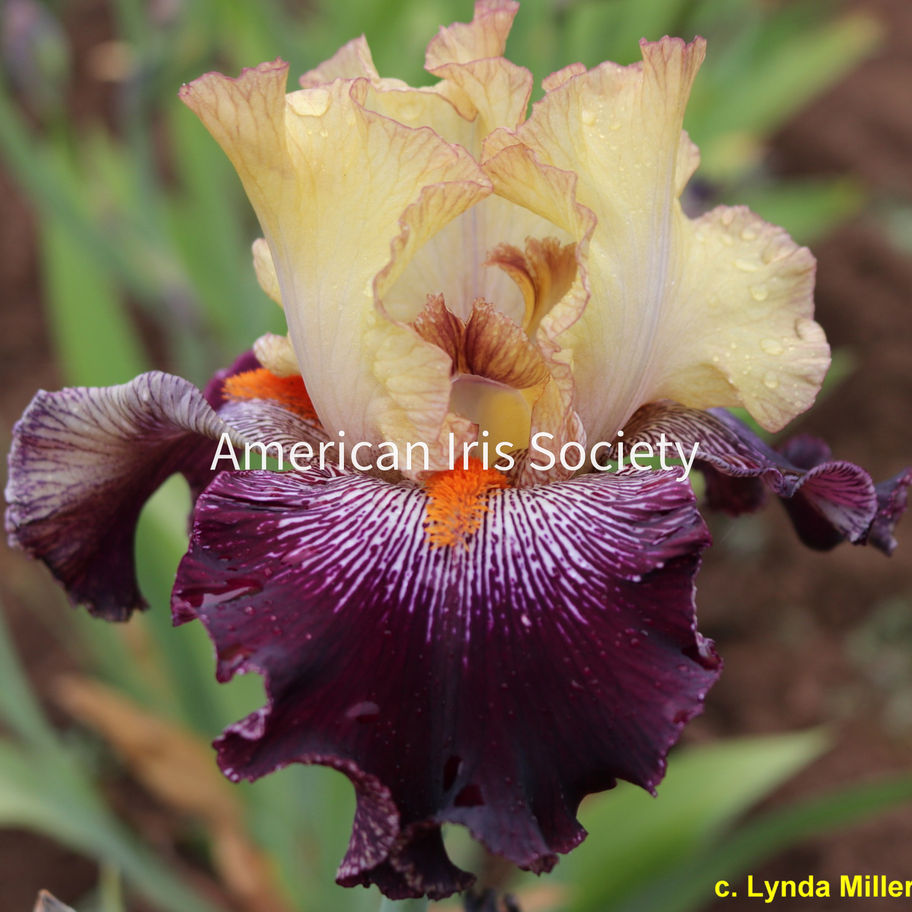 Action Flick (Lynda Miller, 2019) is a commanding tall bearded iris that delivers a bold, high-contrast display in the late midseason garden. Towering at 42" (107 cm), this cultivar features luminous butter yellow standards etched with wine-purple veining and matching style arms, set above falls of saturated, very dark red-violet. A crisp white spray pattern radiates around the dark tangerine beards, all framed by a dramatic picotee edge. With its slight musky fragrance and painterly, pattern-forward coloration, Action Flick is a memorable, exhibition-grade addition for collectors and garden enthusiasts alike. Parentage: Serving Wench X Action Packed. Introduced by Mid America in 2020. Attributes: Edge Trim, Fragrant, Veining