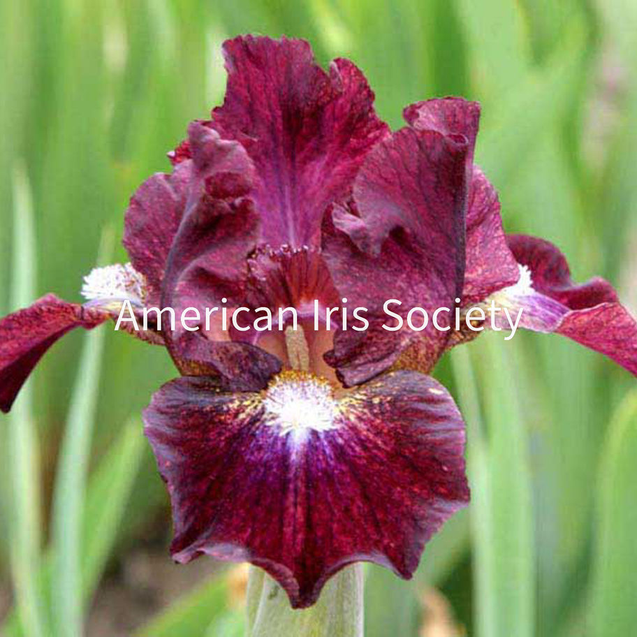 ‘Actor’ (Paul Black, 2011) is a remarkable SDB iris that commands attention with its bold, saturated color and dramatic patterning. Reaching 15.5" (39 cm), this early to midseason bloomer features standards of deep burgundy with darker midribs and veins, accented by a buff patch at the base heavily sanded in burgundy. The style arms are a rich burgundy edged in mid-tan, while the falls showcase a vivid dark burgundy with pronounced veining and a mid-yellow patch around the beard, intricately dotted and veined in dark brown, plus a small violet flash at the beard’s end. The beards themselves are a striking blend: white at the base, transitioning to light-violet tips and old gold in the lower half. With its painterly, high-contrast palette and pedigree from ‘Ghost Ship’ X ‘Fido’ sibling, ‘Actor’ is a true garden showpiece—perfect for collectors and anyone seeking a dynamic, conversation-starting addition to their landscape. Available at Amethyst Creek Farm. Attributes: Edge Trim, Speckled, Veining
