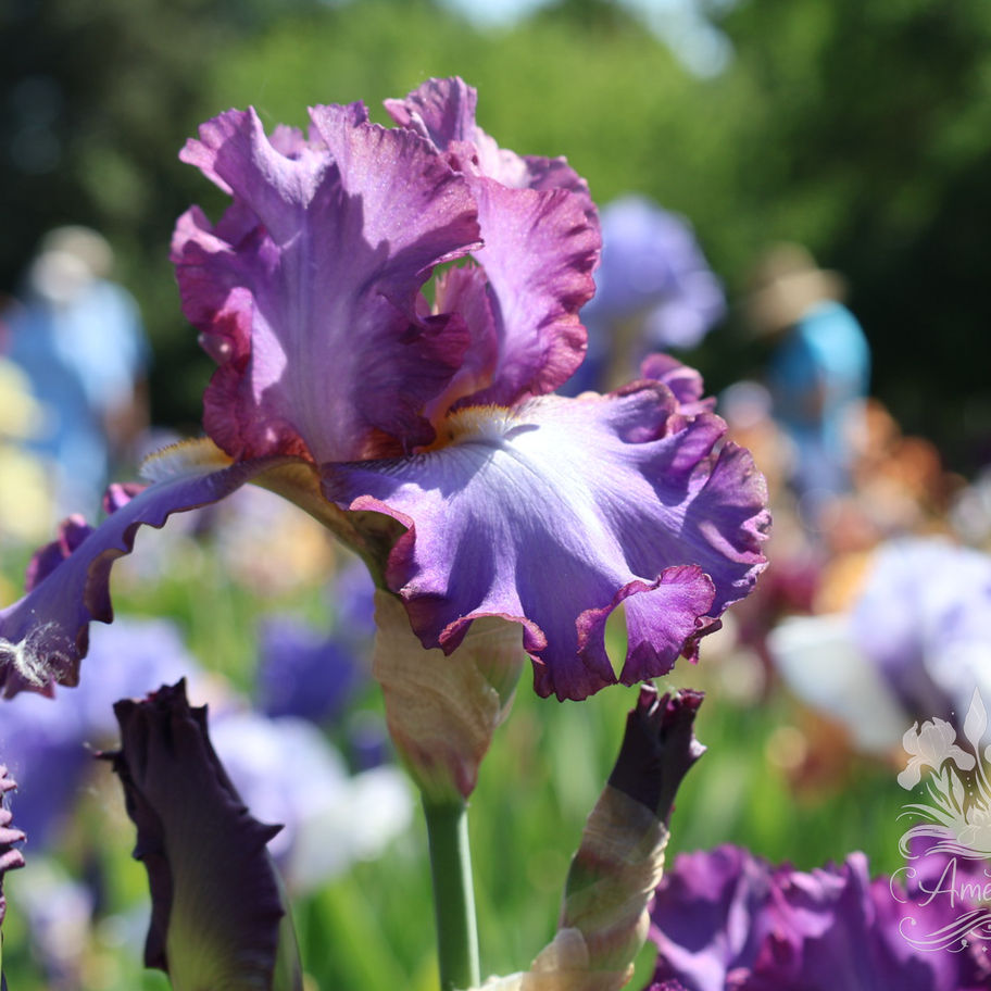 Afternoon In Rio (Schreiner, 2005) is a remarkable tall bearded iris that commands attention with its bold, color-forward presence. Reaching 36" (91 cm) and blooming midseason to late, this award-winning variety features luminous violet-purple standards and deep, saturated falls edged in bronze, highlighted by a dramatic white blaze beneath old gold beards. Its painterly contrast and sculptural form make it a standout in any garden, earning both Honorable Mention (2007) and Award of Merit (2009). Afternoon In Rio is a collector-grade, exhibition-worthy iris with undeniable visual impact—perfect for those seeking a memorable, pedigree-worthy centerpiece. Available at Amethyst Creek Farm. Attributes: Edge Trim, Fertile Awards: Award of Merit, Honorable Mention